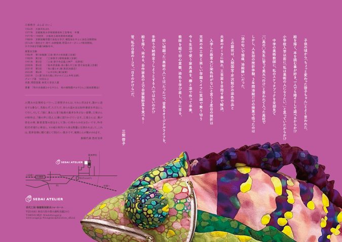 この窮状は,人間国宝、芹沢銈介の染色作品と,夫妻のオーラに触れ,工芸家を目指す事で解決。入学した教育大に染色科がない!と言う2度目の挫折は,充実の木工室と楽しい学園ライフに笑顔で乗り切り、今も生活で使う家具達を、欅と漆で作って卒業、教師を経て初心貫徹、染色を学び直し,今に至る。